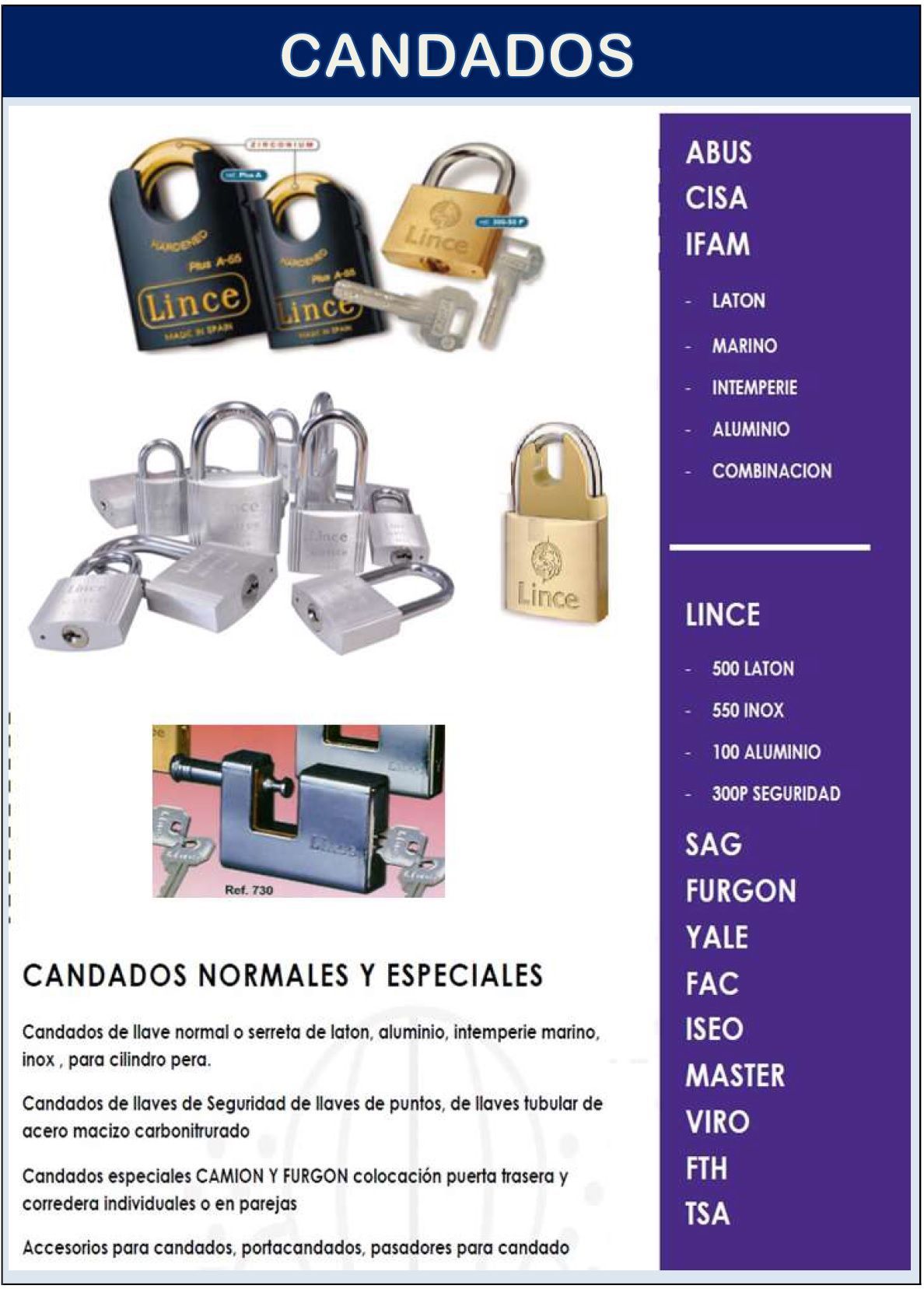 CANDADOS ABUS, CISA, CBM, FAC, FTH, IFAM, ISEO, LINCE, MASTER, SAG, TESA, TIFON, VIRO, YALE
